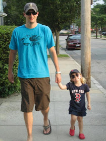 Omg, you were so stinkin' cute in all your Red Sox gear as we took you to your first Pawtucket Red Sox (or PawSox) game. "I look just like Daddy," you exclaimed as I put your Red Sox hat on you (which we've had since before you were born but you hadn't worn yet). PawSox games are perfect for first games. The tickets are cheap, the ballpark is beautiful (especially as the sun sets), & it's a great place for kids. Before the game, kids dangle buckets full of baseballs into the dugout, & the players will sign the balls. Unfortunately, we were running a little behind & didn't get there early enough to try that. We realized that getting there any earlier may have been rough. You cheered & you were cute & you filled up on Dels & fried dough, but by the third inning you were pretty antsy. Sitting is not really a strong suit for you. So, we mostly walked around. Luckily, there's a great view of the field from all angles of the park & a great top walking area. There's also a grassy field that fans can sit on & watch the game. That's where we will definitely be the next time. It was a great place for kids who have a tough time sitting still. We did sit in our seats long enough to get on the jumbotron (yes, you were on the jumbotron at your very first game) & meet Paws, the team mascot. You loved it (you cried when we told you it was time to go) & I got tons of outdoor exercise walking. Win Win!